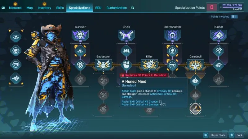 But the real kick in the crotch is with Specializations. Specializations are this game’s take on Badass ranks. Where you can unlock numerous percentage upgrades to many different stats. While also unlocking perks that can change certain aspects of the game. Such as giving action skills, critical chance, and damage, allowing aim down sights while you are fighting for your life, and more.