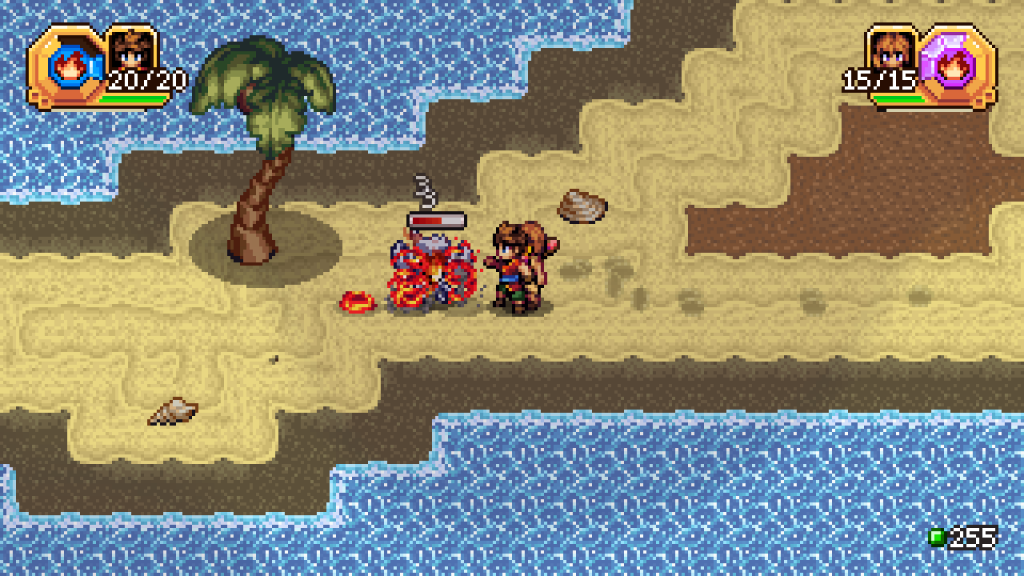Combat mirrors Secret of Mana’s real-time style, blending melee strikes with spellcasting. Gemstones introduce elemental magic, starting with Ice for freezing foes or creating paths, followed by Fire for explosive damage. These spells interact dynamically with enemies and environments, exploiting weaknesses, solving puzzles, and clearing obstacles. The game remains largely linear, with side paths yielding treasures but rarely straying far from the main route.