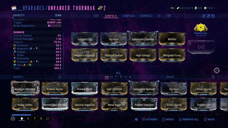 Below will be our mod setup for the Thornbak. You will need at least 2 forma and have completed Warframe: 1999 to obtain some of the mods and arcane used: