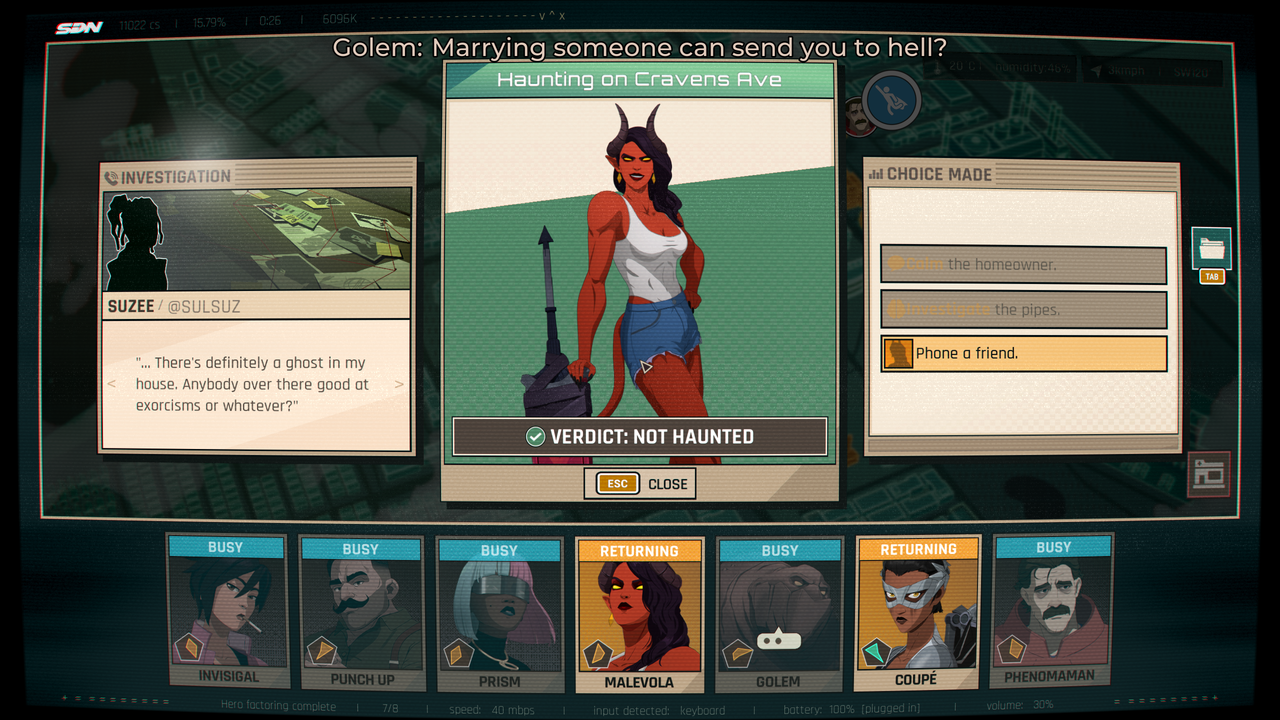 In Dispatch, players step into the boots of Robert Robertson (aka Mecha Man), an out-of-commission superhero forced into a desk job at the Superhero Dispatch Network after his suit is wrecked by arch-nemesis Shroud. Managing a ragtag team of reformed supervillains, the Z-Team, you assign them to emergencies via a tactical map while balancing stats, cooldowns, and risks. Robert will also navigate romances, betrayals, revenge and rebuilding his suit in a fictional version of Los Angeles. Branching choices shape relationships and multiple endings.