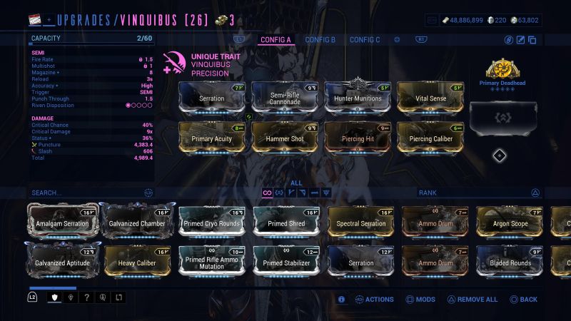 For the Rifle version of Vinquibus, I went for a pure critical build that uses Primary Acuity and Semi-Rifle Cannonade alongside all the fixings. I also went purely for Puncture due to the low status chance the weapon has.
