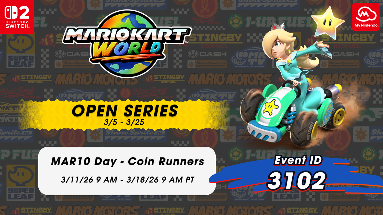- Mario Kart World My Nintendo Open Series: Week 2 – Jump into the Mario Kart World My Nintendo Open Series and hit the track for three weeks of fast-paced fun. This week, test your skills in Coin Runners! You can also take a screenshot of your epic moments from the events and share your best shots online using the Nintendo Switch app. Use #MAR10Day to connect with fellow racers and showcase your best moves! For more information, check out this page: https://my.nintendo.com/news/a78895afee7e446a.
