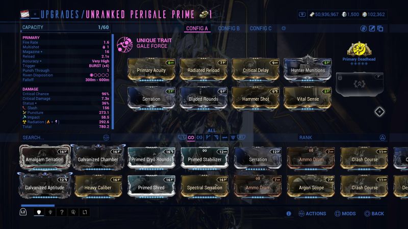 Let’s face it, with good critical stats out of the gate, going all in on it is the best idea. Mix in Primary Acuity, and the usual critical synergy above. It’ll give you good orange and red crits with crazy damage numbers with the bleed procs. Primary Deadhead works well, too, but you could always switch it to Primary Merciless if you feel you aren’t pulling off headshot kills in Steel Path or other endgame activities. It will let you still get the damage boost, but without the drawbacks of an enemy dying to bleed as opposed to the headshots.